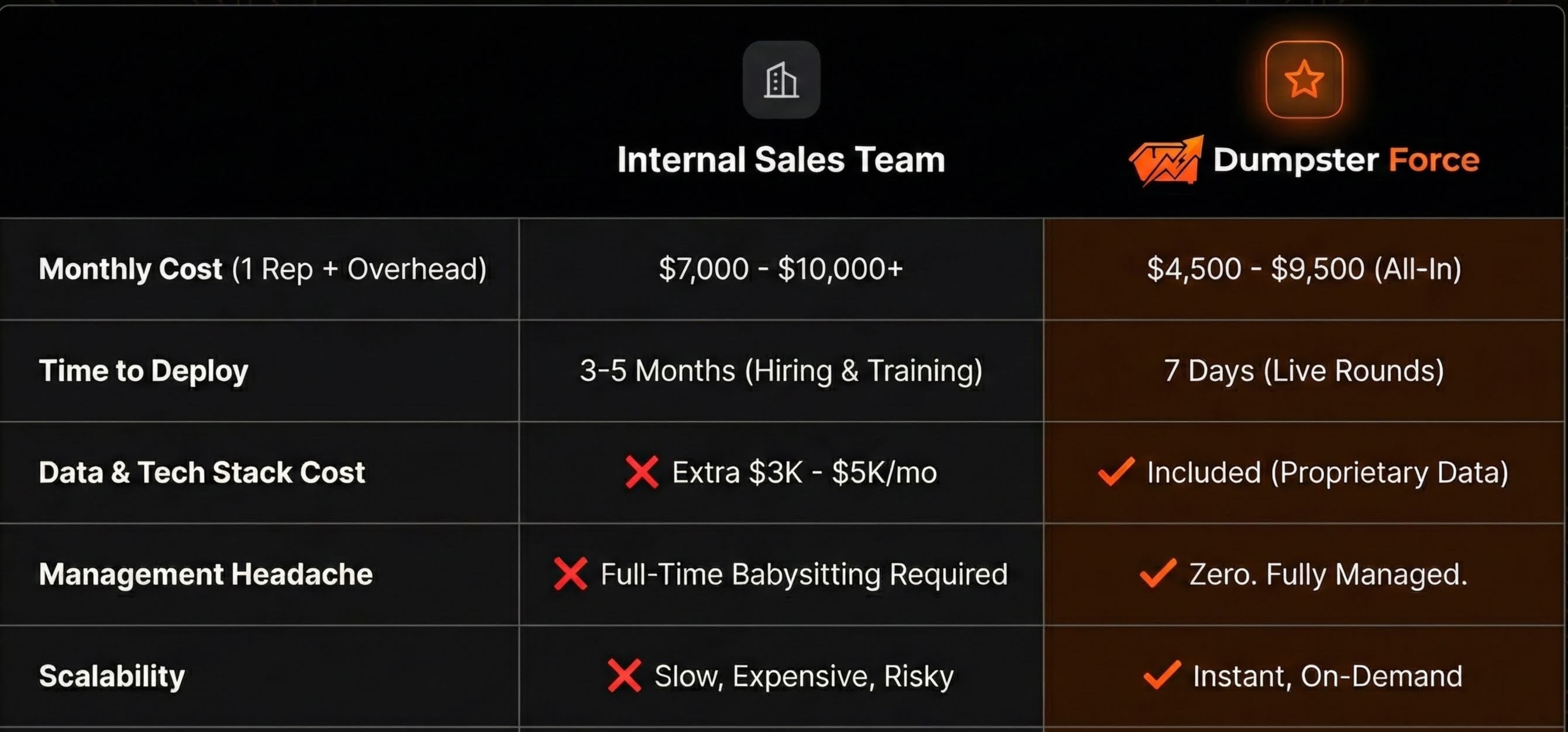 Outsourcing your sales to Dumpster Force means you get the output of a full sales department for less than the cost of one bad hire. We handle the hiring, training, management, and technology. You just handle the logistics.